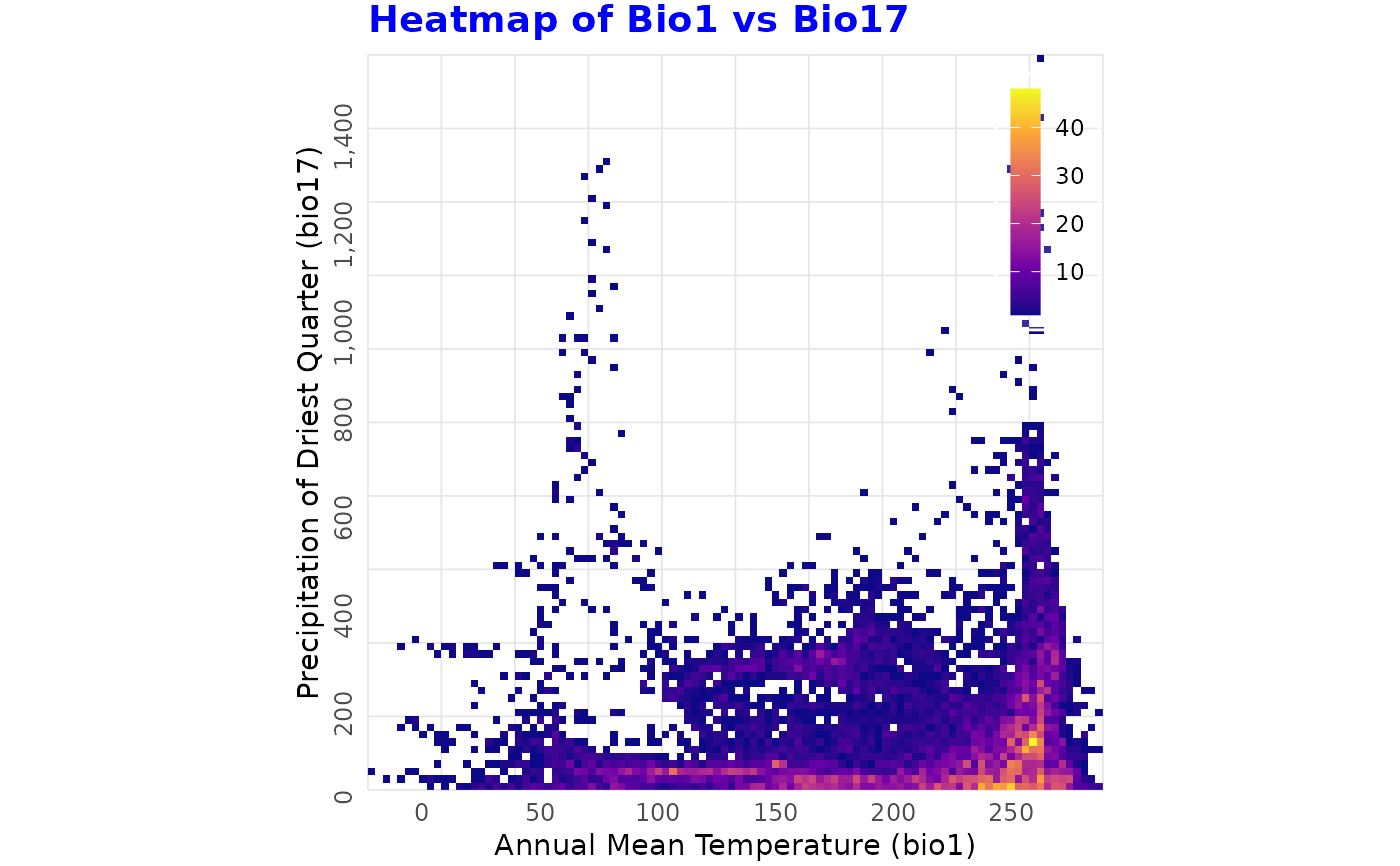 # Plotting frequency heatmaps of bioclimatic variables from the dismo package